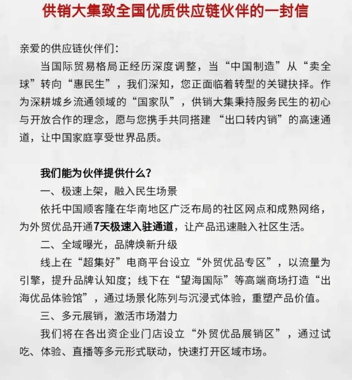 供销大集发布致供应链伙伴的一封信 多项举措支持外贸优品“出口转内销”