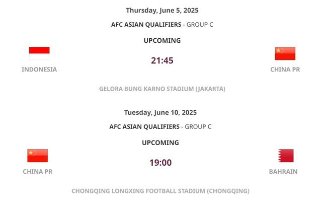 4月14日晚,亚足联官网更新了2026年世界杯亚洲区预赛十八强赛C组最后两轮比赛的开球时间,其中6月5日中国男足客场对阵印度尼西亚队的比赛将于北京时间21时45分开球,6月10日国足主场对阵巴林队的比赛则将于19时整开球。