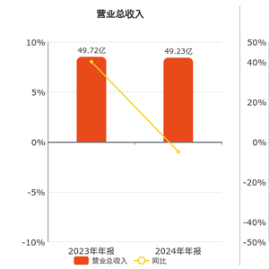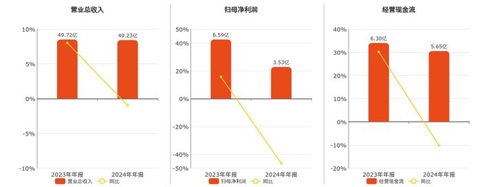 公司营业总收入为49.23亿元,较去年同报告期营业总收入减少4877.09万元,同比较去年同期下降0.98%。归母净利润为3.53亿元,较去年同报告期归母净利润减少3.06亿元,同比较去年同期下降46.42%。经营活动现金净流入为5.65亿元,较去年同报告期经营活动现金净流入减少6434.51万元,同比较去年同期下降10.22%。