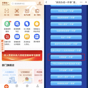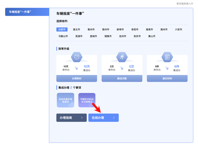 1.登录安徽省政务服务网,点击“高效办成一件事”,搜索“车辆报废一件事”,选择地市后点击“在线办理”。