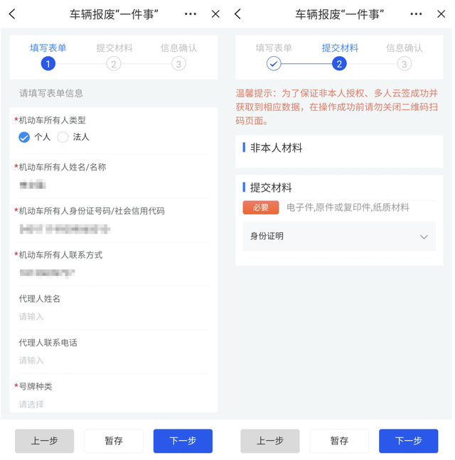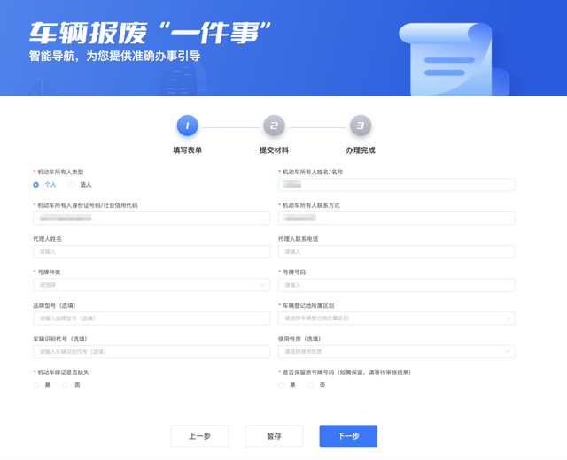 3.核对系统带入的车主身份信息,填写拟报废车辆信息、按照页面提示上传相关材料,在线提交申请。