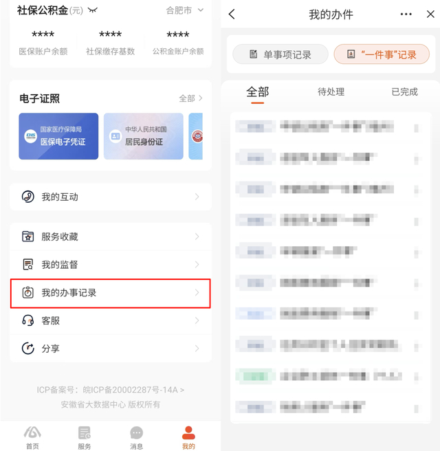 4.查看进度可登录皖事通,点击“我的”,找到“我的办事记录”,在“一件事记录”里面查看具体的办理进度。