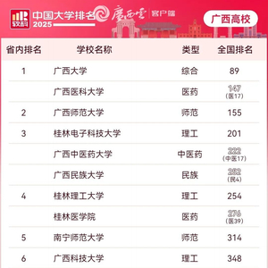 中国大学排名总榜(广西公办高校)。