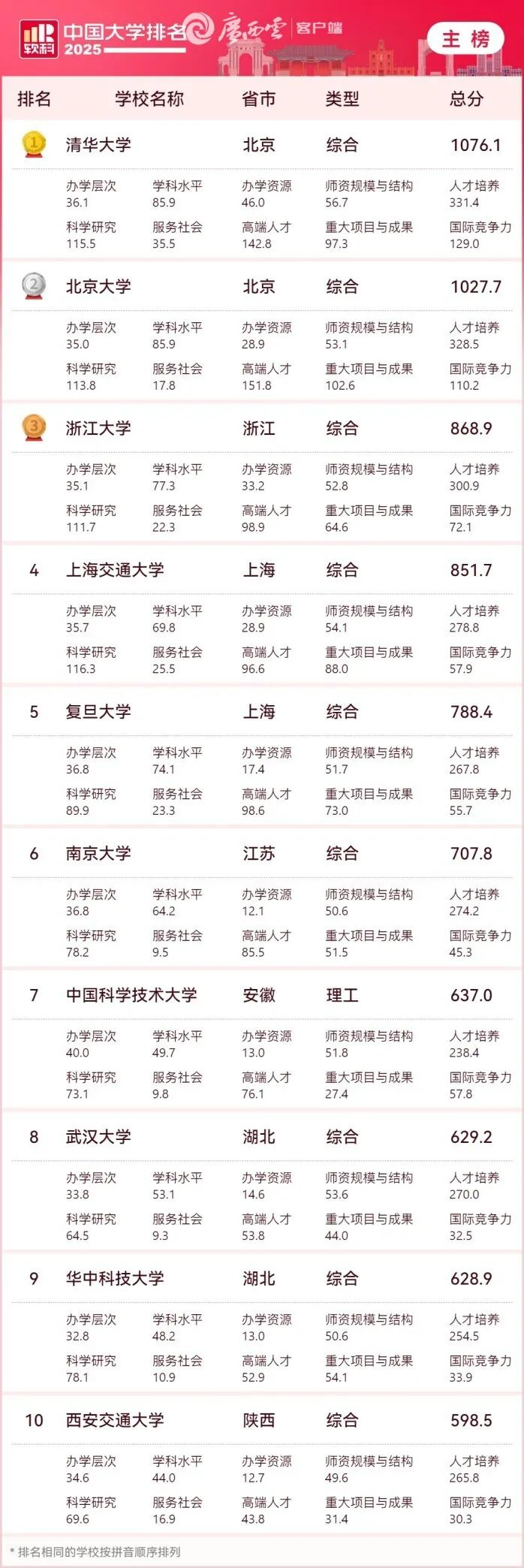 “2025软科中国大学排名”(主榜十强)。