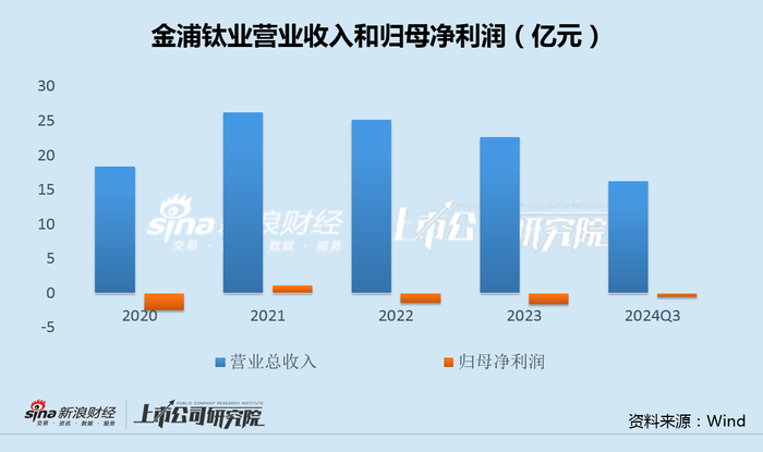 2022年至2024年前三季度,金浦钛业营收分别为25.10亿、22.64亿、16.24亿,增速连续下滑;2022年至2024年,公司归母净利润分别为-1.46亿、-1.61亿、-2.01亿至-2.65亿,连续三年亏损。