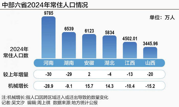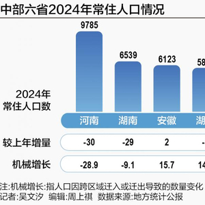 截至2024年末,中部地区河南、湖南、安徽、湖北、江西、山西六个省份常住人口分别为9785万人、6539万人、6123万人、5834万人、4502.01万人、3445.96万人。相比2023年,仅有安徽实现了人口正增长,比上年末增加2万人;湖北、江西、山西、湖南、河南常住人口依次减少了4万人、13万人、20万人、29万人、30万人。