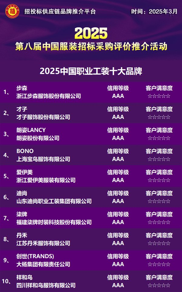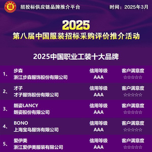 近日,招投标供应链品牌推介平台正式发布“2025中国职业工装十大品牌”榜单。步森、才子、朗姿LANCY、BONO、爱伊美、迪尚、柒牌、丹禾、创世(TRANDS)、祥和鸟等品牌凭借智能化生产体系、功能性场景创新与全生命周期服务能力成功入选,展现了我国职业工装优秀企业在数字化转型与可持续发展中的引领作用。活动旨在树立行业“中国品牌”标杆,推动我国工装行业向智能化、绿色化、品质化方向高质量发展。