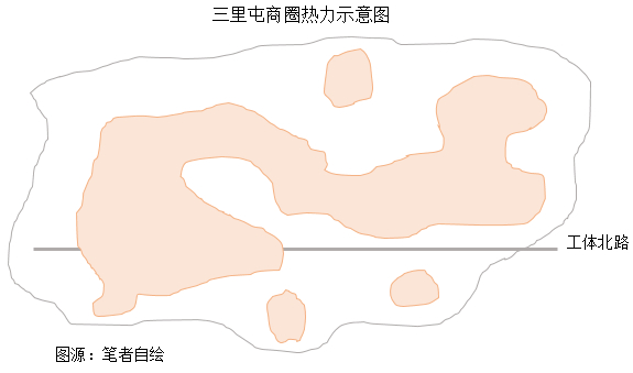 按照这样的思路讨论商圈,很多所谓商圈定义是不确切的,两三个互不相干的商业设施散落在邻近街道三、四公里的区位,各行其事,所谓商圈只是一个形象描述。也有比较理想的商圈图景,比如,三里屯商圈就是值得深度挖掘的标杆。一是项目之间协同联动友好,光顾频度高,二是项目特性互补,消费转化率均较高,三是文化口碑持久不衰,影响力超出地域范畴。