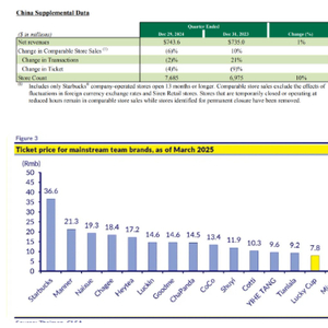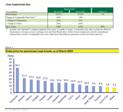 据星巴克2025财年第一季度财报(2024年自然年第四季度),星巴克中国共有7685家门店,门店数增长10%,该季度净收入7.436亿美元,同比增长1%;可比同店收入下滑6%,去年同期数字为增长10%。