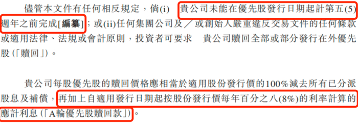 该笔投资内含对赌赎回条款,其提及一个时间点为“优先股发行日期起计第五周年”,即2026年。若双方约定的条款没有完成,投资者可以要求卡游赎回全部或部分发行在外的优先股,而每股优先股的赎回价格将再加上自适用发行日期起按股份发行价每年8%的利率计算的应计利息。