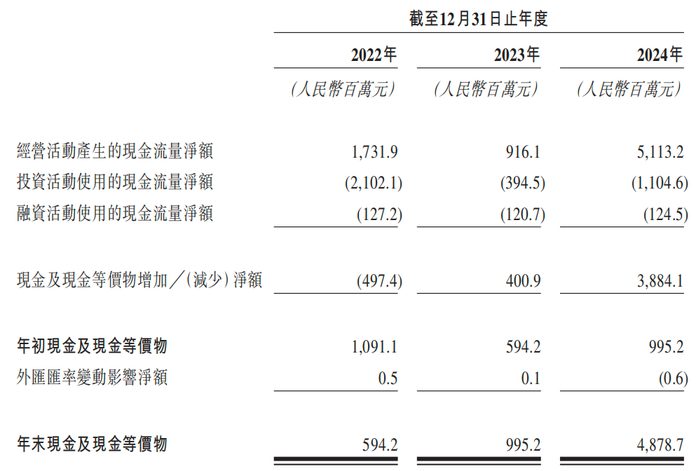 在更新的招股书中,卡游的现金流状况发生了大幅变动,其经营活动产生的现金流量净额2022年、2023年分别为17.32亿元、9.16亿元,但是2024年暴增至51.13亿元,较2023年猛增458%。