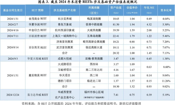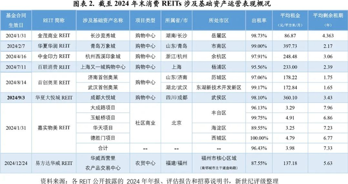 截至2024年末,8支存续的消费REITs的基础资产集中于直辖市、省会城市和计划单列市,其中6支消费REITs的基础资产类型为购物中心,社区商业和农贸市场各1支。