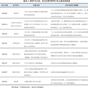 近年来国家重大战略和宏观调控政策均鼓励发展消费基础设施、改善消费条件、提升消费环境,以此促进消费增长,为消费基础设施发行REITs提供充足的政策支持。2020年9月,国务院发布《关于以新业态新模式引领新型消费加快发展的意见》(国办发(2020)32号)提出:“加快新型消费基础设施和服务保障能力建设”;2021年2月,国务院发布“十四五规划”纲要提出:“鼓励消费新模式新业态发展”,“改善消费环境”;2022-2025年,国务院和国家发改委于有关“提振消费”的意见、措施和方案中分别提出:“改善消费条件”、“推动重点商贸街巷改造升级”、“消费环境改善提升行动”等指导意见。