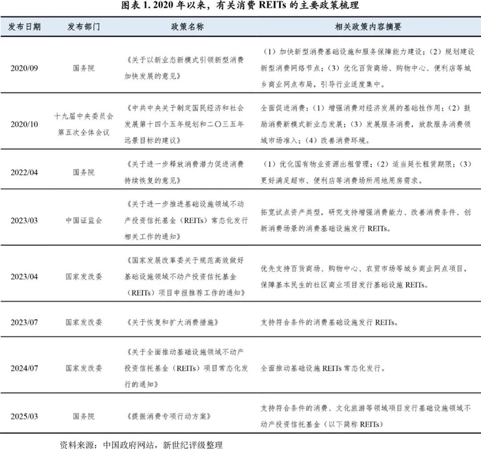 为贯彻落实中央经济工作会议关于着力扩大国内需求,优化政策措施,充分发挥消费的基础作用,把恢复和扩大消费摆在优先位置的决策部署,2023年3月,证监会发布《关于进一步推进基础设施领域不动产投资信托基金(REITs)常态化发行相关工作的通知》(以下简称为《通知》),于“拓宽试点资产类型”的要求中提出“研究支持增强消费能力、改善消费条件、创新消费场景的消费基础设施发行基础设施REITs”和“优先支持百货商场、购物中心、农贸市场等城乡网点项目,保障民生的社区商业项目发行基础设施REITs”,标志着消费REITs正式开始试点发行。2023年7月及2025年3月,《关于恢复和扩大消费措施》和《提振消费专项行动方案》连续明确地提出支持符合条件的消费基础设施发行REITs。预计将有更多地区和类型的消费基础设施抓住政策窗口期发行REITs。