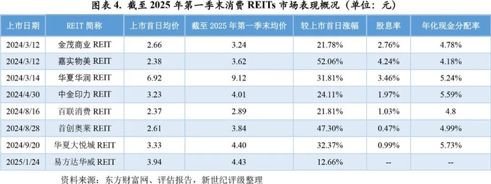 截至2025年第一季度末,各消费REITs的交易价格均较上市首日有较大的涨幅,其中交易价格最高的为华夏华润REIT的9.12元,涨幅最大的为嘉实物美REIT的52.06%。
