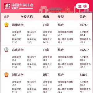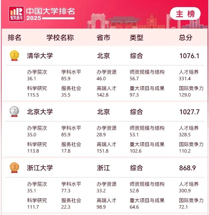 2025软科中国大学排名(主榜)的上榜高校共有589所(排名相同的学校按拼音顺序排列),清华大学、北京大学、浙江大学连续11年蝉联全国三甲,实力强劲。上海交通大学、复旦大学位列全国前五。其他位列全国前十名的大学依次为南京大学(第六)、中国科学技术大学(第七)、武汉大学(第八)、华中科技大学(第九)、西安交通大学(第十)。