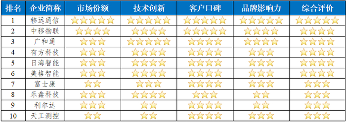 我们通过多维度指标对中国通信模组企业综合竞争力进行多方评判,结果如下: