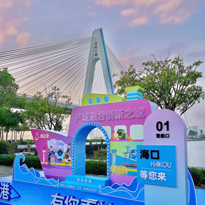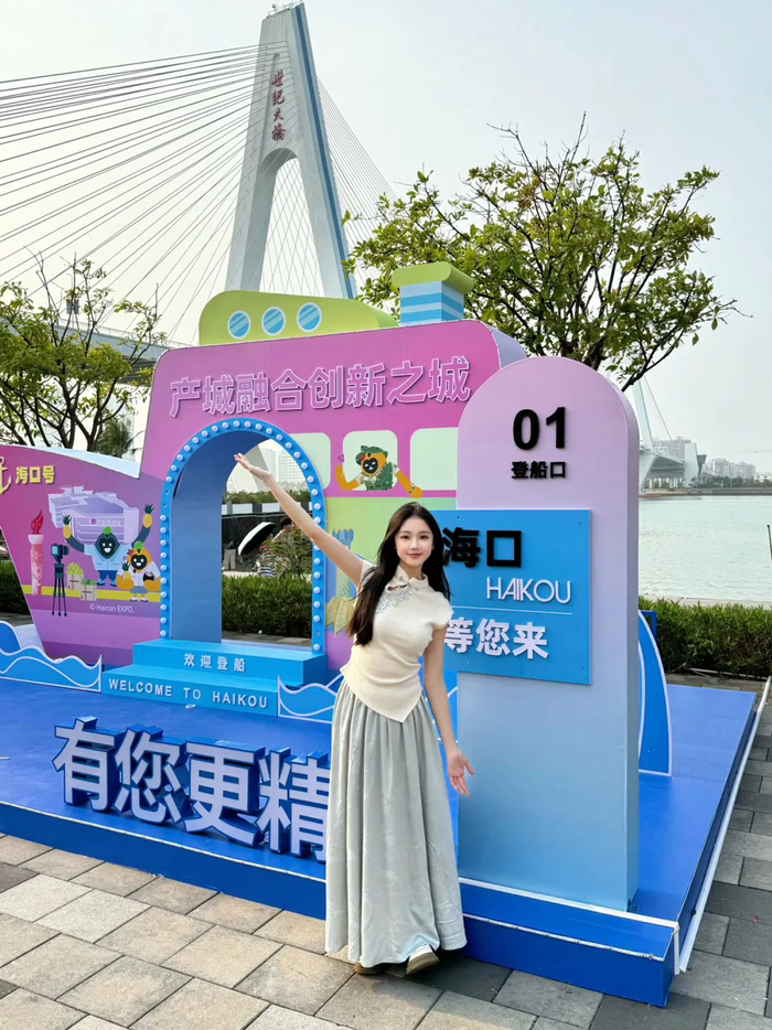 今天是看到这个打卡点特意过来拍照的,刚好今天的天气也比较好,然后背景就是这个世纪大桥,会看到很多关于消博会的一些展出的东西。消博会的话,这一次我还是会去参加,希望能看到更多好玩有趣的东西。