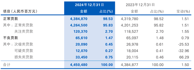 业绩下滑的同时,资产质量的恶化趋势不容乐观。数据显示,截至2024年末,民生银行不良贷款总额656.10亿元,比上年末增加5.13亿元;不良贷款率1.47%,比上年末下降0.01个百分点。表面上,民生银行2024年不良贷款率为1.47%,与2023年的1.48%相比略有下降,但内部数据却显示风险仍在加剧。损失类贷款激增66%至334.5亿元,房地产贷款不良率攀升至5.01%。