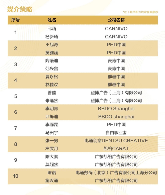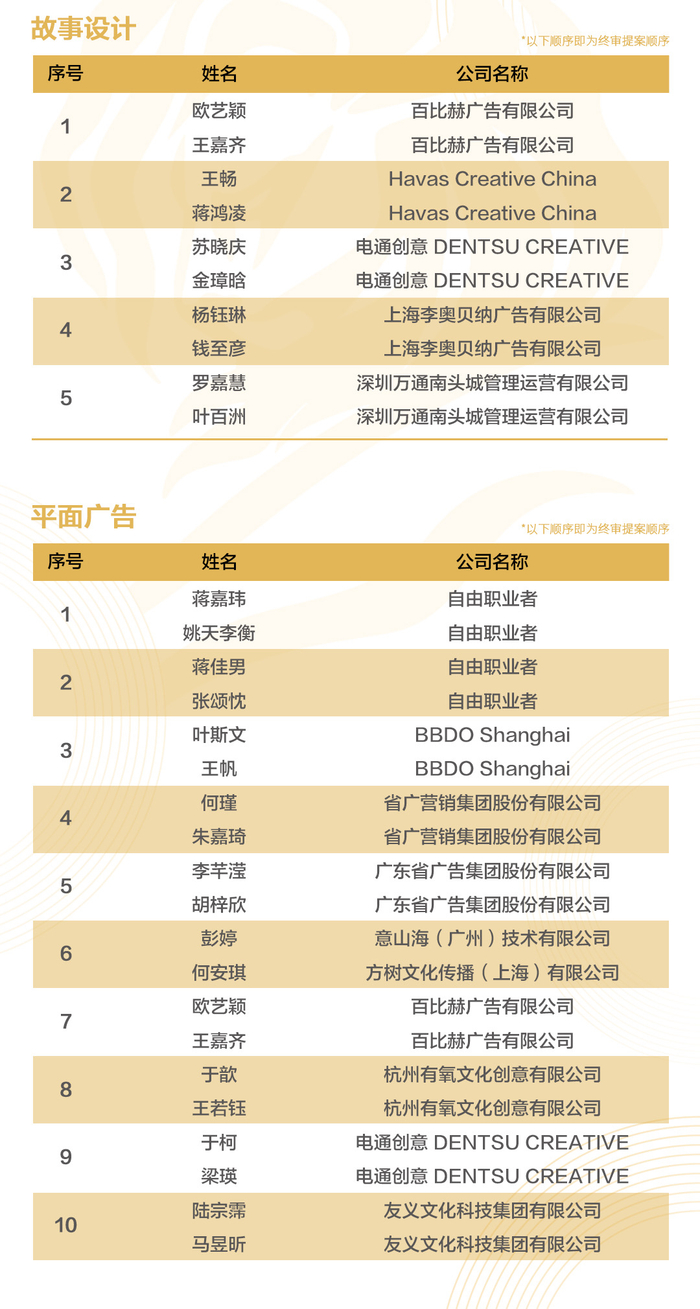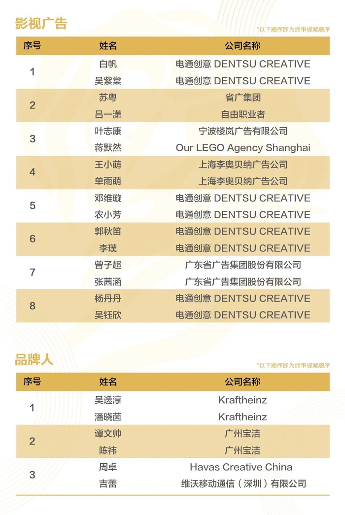 名单公布顺序即为终审提案顺序: