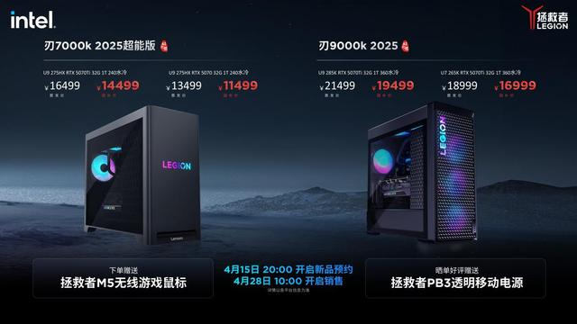 刃7000K超能版 AI元启推出搭载英特尔酷睿Ultra 9 275HX处理器的两种配置组合,其中RTX 5070 Ti版本国补价14,499元,RTX 5070版本国补价11,499元。面向更高性能需求的刃9000K AI元启则提供Ultra 9 285K+RTX 5070 Ti的19,499元旗舰配置,以及Ultra 7 265K版本的16,999元主流选择,为专业用户构建多元性能解决方案。全系台式机将于4月15日20:00启动预约,4月28日10:00点正式发售,购机即赠拯救者M5无线游戏鼠标,晒单可额外获得PB3透明移动电源。