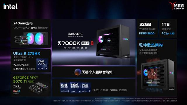 除了拯救者Y9000P 2025至尊版 AI元启之外,直播同步发布了联想拯救者台式机新品刃7000K超能版 AI元启,其搭载英特尔酷睿Ultra 9 275HX处理器,采用无顶盖直触散热设计,全新设计的垂直风道机箱配备5组12cm风扇系统,底部直吹设计配合850W整机解热能力,在240mm水冷系统的加持下,可完美承载600W RTX 5070 Ti显卡与253W CPU的双重火力输出。