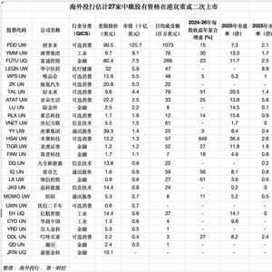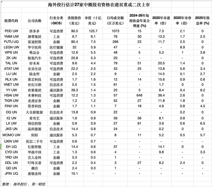 根据高盛的估算,目前共有27家中概股符合在香港进行双重或第二上市的条件。这些公司涵盖多个行业,包括消费(如拼多多、唯品会、亚朵生活、极氪汽车、好未来)、金融(如富途控股、陆金所、老虎证券、简普科技)、信息技术(如禾赛科技、晶科能源)、通讯服务(如爱奇艺、欢聚集团、陌陌)、医疗健康(如华宇医药)、工业(如满帮集团、亿航智能、华晨中国)等。