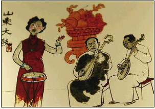 山东大鼓是我国北方现存最早的民间曲艺。它最初是农民在农闲时敲犁铧碎片演唱的秧歌调,故称“犁铧大鼓”。刘鹗在《老残游记》中又加以美化,据其谐音改称为“梨花大鼓”,从业艺人则叫做“唱梨花片的”。后来逐渐发展成为有板式变化的成套唱腔,再后来出现了流动的民间艺人,到各地演唱,并形成了孙、赵两大门户,流传日益广泛。