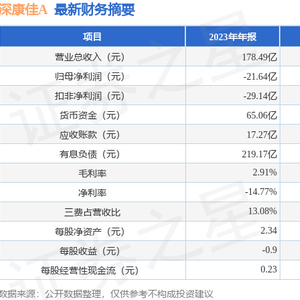 据证券之星公开数据整理,近期深康佳A(000016)发布2024年年报。截至本报告期末,公司营业总收入111.15亿元,同比下降37.73%,归母净利润-32.96亿元,同比下降52.31%。按单季度数据看,第四季度营业总收入29.95亿元,同比上升0.74%,第四季度归母净利润-16.9亿元,同比下降16.6%。本报告期深康佳A短期债务压力上升,流动比率达0.63。