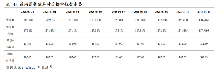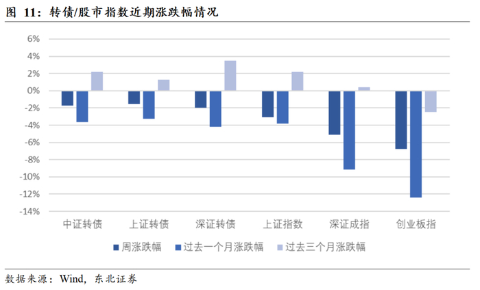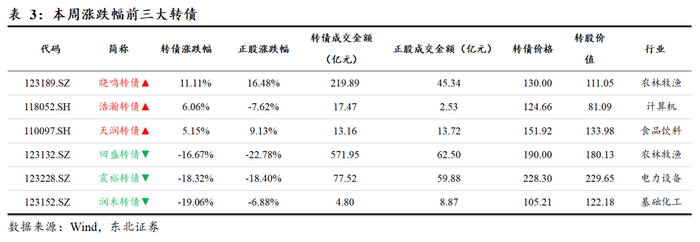 本周转债市场探底回升,食品饮料、农林牧渔行业转债上涨,涨幅分别为0.90%、0.13%;汽车、电力设备、机械设备行业跌幅靠前,跌幅分别为-2.92%、-2.91%、-2.83%。本周转债绝对价格中位数为120.40。股票市场方面,农林牧渔、商贸零售、国防军工行业涨幅靠前,涨幅分别为3.28%、2.88%、0.28%;电力设备、通信、机械设备行业跌幅靠前,跌幅分别为-8.09%、-7.67%、-6.78%。