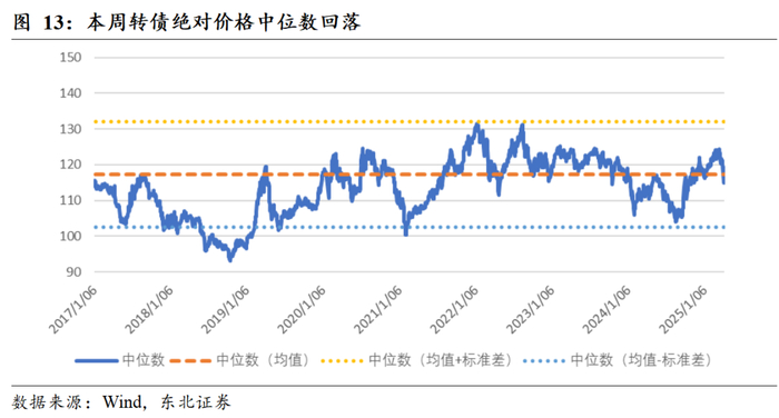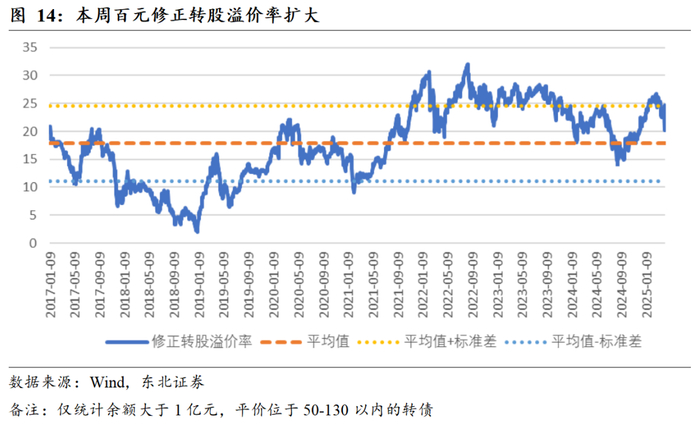 本周百元修正转债转股溢价率有所扩大。分平价区间转股溢价率方面,平价在50-60、70-80、80-90、100-110、130以上的转债转股溢价率平均值变动不显著,平价在60-70、90-100、110-120、120-130的转债转股溢价率平均值扩大,平价在40以下、40-50的转债转股溢价率平均值缩小。