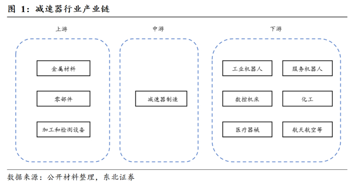 减速器产业链上游为铜材、钢材等金属材料,以及轴承、箱体等零部件和生产设备,这些基础材料和零部件是减速机制造的基本需求,其质量和供应稳定性对减速机生产具有重要影响;产业链中游为减速器制造;产业链下游为应用领域,包括工业机器人、服务机器人、数控机床、化工、医疗机械、航空航天等主要领域。
