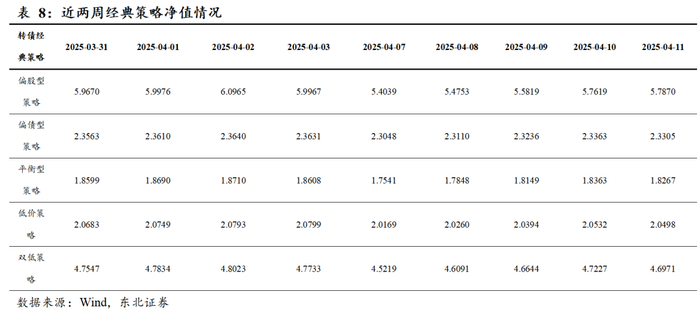 本周各经典策略收益率均为负,其中偏股型策略收益率为-3.50%,偏债型策略收益率为-1.38%,平衡型策略收益率为-1.84%,低价策略收益率为-1.45%,双低策略收益率为-1.59%。