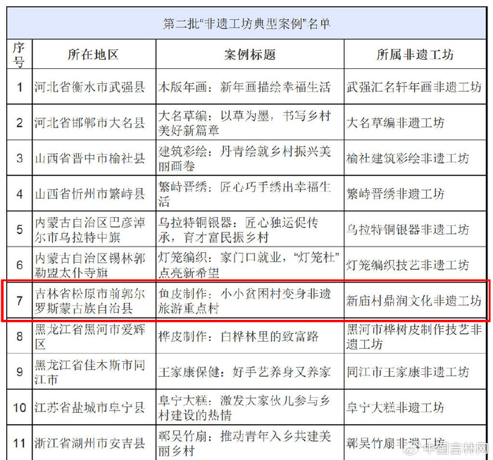 ★4月15日,文化和旅游部网站发布通知,公布第二批“非遗工坊典型案例”名单,吉林省1个案例入选。
