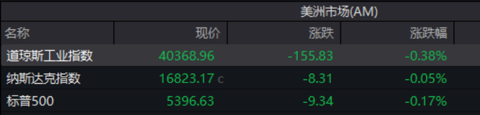 当地时间4月15日(周二),美国三大股指小幅收跌,总体表现平稳,其中道指跌0.38%,报40368.96点,标普500指数跌0.17%,报5396.63点,纳指跌0.05%,报16823.17点。