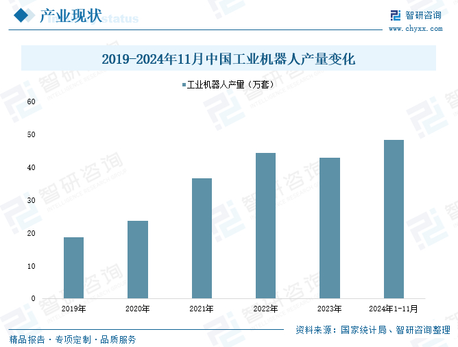 当前,全球正经历着前所未有的经济和技术变革,这些变革不仅增加了制造业和物流领域对机器人及自动化技术的长期需求,还对自动化系统的智能化水平、运行速度和效率提出了更高要求。人工智能技术的应用为机器人行业注入了强大的动力。机器人在处理那些对人类来说过于繁重、重复、乏味、污秽或危险的工作时展现出明显优势。借助人工智能,机器人能够更加高效地完成这些任务,展现出更大的潜能和发展前景。作为制造业大国,我国对工业机器人的需求十分旺盛。在此背景下,我国逐渐成为全球最大工业机器人生产及消费市场。根据国家统计局公布数据,2023年我国工业机器人生产规模为42.95万套,2024年1-11月已达到48.39万套。目前我国工业机器人出货量占全球出货量的比例已由2013年的14%提升至2023年的51%,占据了全球一半以上的市场份额。