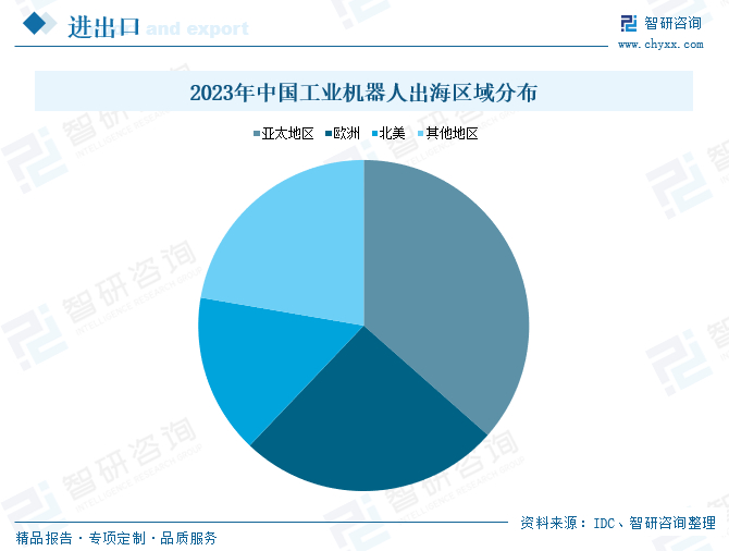 因此,2023年以来,我国厂商凭借国内成熟产业链带来的价格优势起步,借助于国内丰富的应用场景形成的规模优势加速市场拓展,正通过产品快速迭代强化智能体验以打造新的竞争优势,日益获得海外市场认可。海关数据显示,2023年我国工业机器人出口增速达到86.4%。根据统计,2023年我国工业机器人厂商的出海收入合计约95.8亿元人民币,亚太、欧洲、北美等主要市场区域贡献了国产工业机器人厂商境外收入的90%。进入2024年,我国工业机器人需求放缓态势虽有减缓,且2024年全年国内工业机器人出口增速下降至45.2%,但产品“出海”已成为国产工业机器人品牌业务拓展关注的重要方向,将持续为我国工业机器人行业提供发展空间。