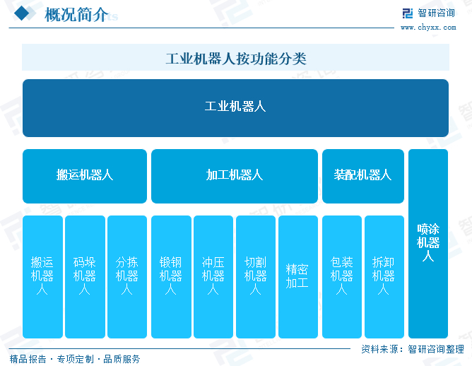工业机器人,也被称为产业机器人,是一种能够自动定位控制、可重复编程的、多功能的、多自由度的操作机,主要用于代替人工从事柔性生产环节,如搬运材料、零件或操持工具,以完成各种作业。按功能划分为搬运机器人、加工机器人、装配机器人、喷涂机器人等。此外,还有一些其他类型的工业机器人,如激光加工机器人、真空机器人等,它们分别应用于激光加工、真空环境作业等特殊领域。