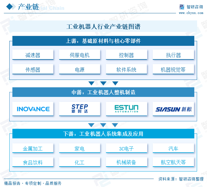 工业机器人行业产业链可分为上游机器人基础原材料与核心零部件、中游机器人整机制造和下游机器人系统集成及应用等三大产业链环节。产业链上游主要提供基础原材料和核心零部件,关键的核心部件包括伺服系统、减速器和控制器,它们直接影响着机器人的性能、稳定性和负载能力。这些部件构成了工业机器人的核心技术,是整个产业链中技术难度最高的一环,也是中国机器人产业未来发展的关键突破点。