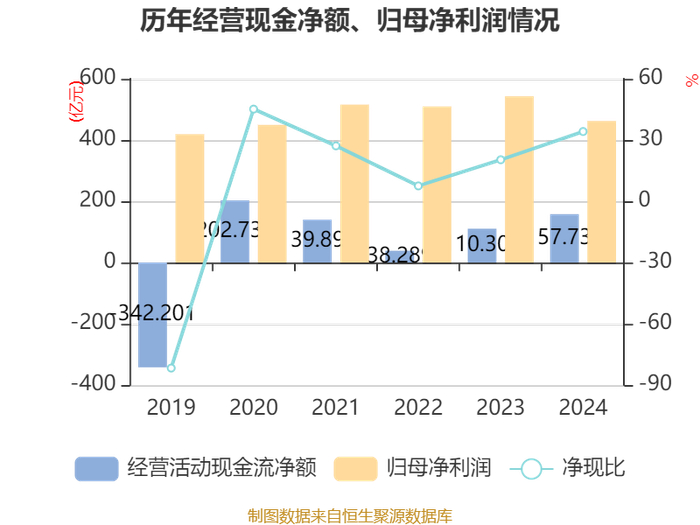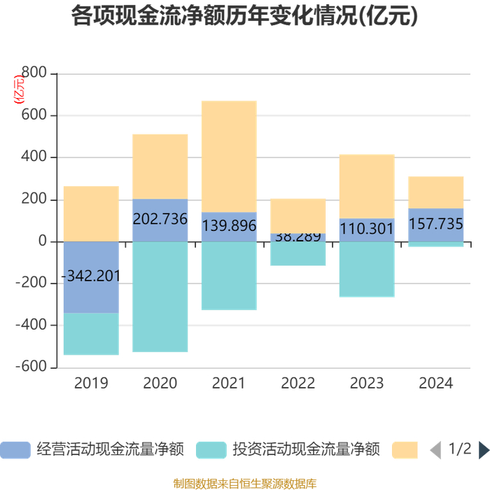 截至2024年,公司经营活动现金流净额为157.74亿元,同比增长43%;筹资活动现金流净额151.68亿元,同比减少152.83亿元;投资活动现金流净额-25.11亿元,上年同期为-265.02亿元。