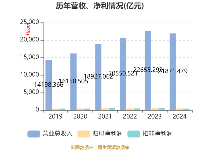 中证智能财讯中国建筑(601668)4月16日披露2024年年度报告。2024年,公司实现营业总收入21871.48亿元,同比下降3.46%;归母净利润461.87亿元,同比下降14.88%;扣非净利润415.81亿元,同比下降14.33%;经营活动产生的现金流量净额为157.74亿元,同比增长43.00%;报告期内,中国建筑基本每股收益为1.11元,加权平均净资产收益率为10.37%。公司2024年度分配预案为:拟向全体股东每10股派现2.715元(含税)。