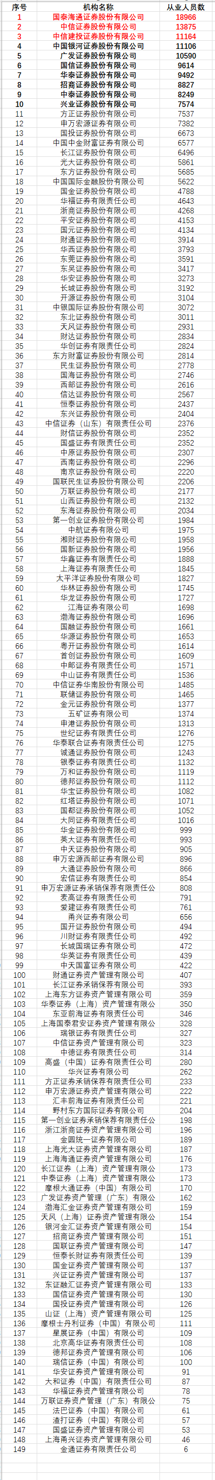 2025年国内149家券商排名(按从业人员数量)!合计331202人,前三名44005人,前十名109457人,占比超过1/3.