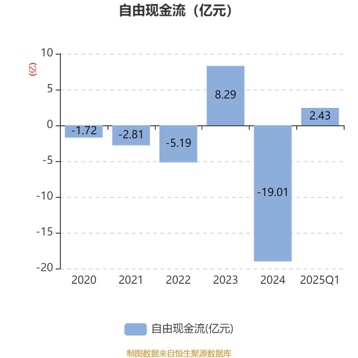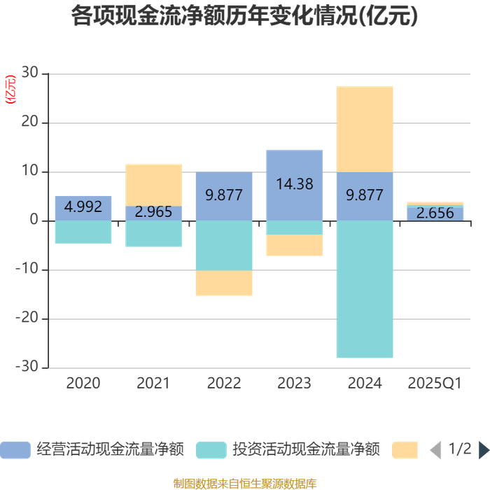 截至2025年一季度末,公司经营活动现金流净额为2.66亿元,同比增长67.57%;筹资活动现金流净额6510.68万元,同比减少17.34亿元;投资活动现金流净额4709.12万元,上年同期为-2.57亿元。