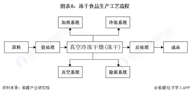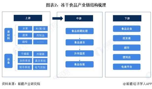 我国的冻干食品行业整体隶属于农产品和农副产品加工行业,行业上游主要是原材料和冻干设备,中游是食品冻干加工,行业下游则是批发商、商超、便利店和食品企业等渠道。