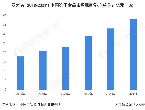 中国食品报数据显示,2019年中国冻干食品市场规模约为18亿元,2020年我国冻干食品市场规模超21亿元,行业呈现出强劲的发展态势。近年来食品巨头在冻干食品业的布局,如好想你已投资4.4亿元建设年产1万吨电商代工红枣及其休闲食品项目,到2023年我国冻干食品市场规模增长至33亿元,初步统计2024年市场规模将达到38亿元。