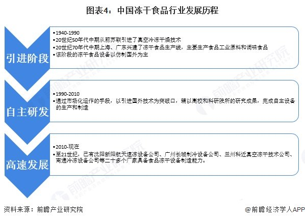 我国冻干食品行业发展历程总共可分为三个发展阶段:引进阶段(1940-1990),该阶段的冻干食品设备以仿制国外为主;自主研发阶段(1990-2010),通过市场化运作的手段,以引进国外技术为突破口,辅以高校和科研院所的研究成果,完成自主设备的生产和制造;高速发展阶段(2010至今),食品冻干技术取得了长足进展。