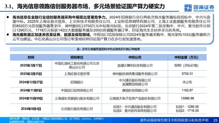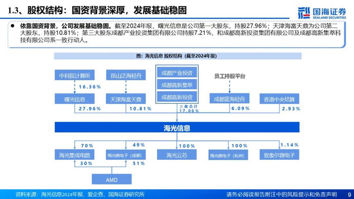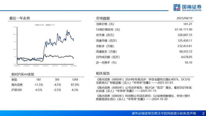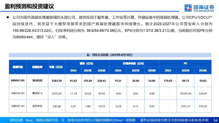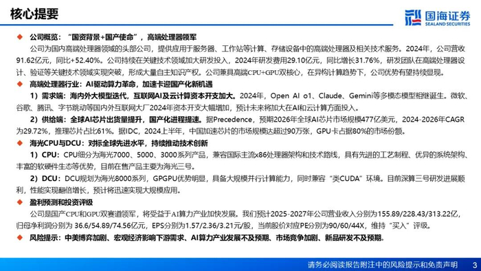 公司为国内高端处理器领域的头部公司,提供应用于服务器、工作站等计算、存储设备中的高端处理器及相关技术服务。2024年,公司营收91.62亿元,同比+52.40%。公司持续在关键技术领域加大研发投入,2024年研发费用29.10亿元,同比增长31.76%,研发团队在高端处理器设计、验证等关键技术领域实现突破,形成大量自主知识产权。公司兼具高端CPU+GPU双核心,在异构计算趋势下,公司优势有望持续显现。