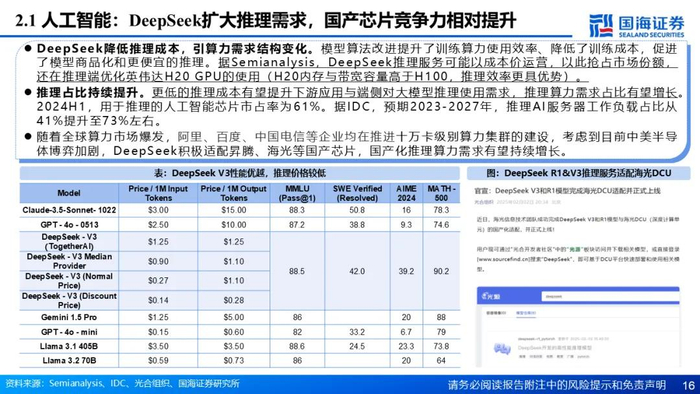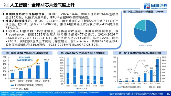 2)供给端:全球AI芯片出货量提升,国产化进程提速。据Precedence,预期2026年全球AI芯片市场规模477亿美元,2024-2026年CAGR为29.72%,推理芯片占比61%。据IDC,2024上半年,中国加速芯片的市场规模达超过90万张,GPU卡占据80%的市场份额。