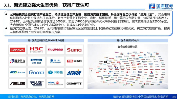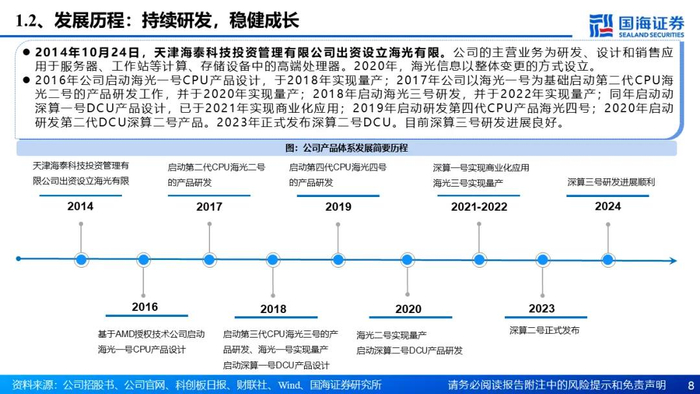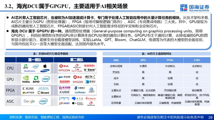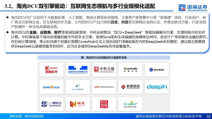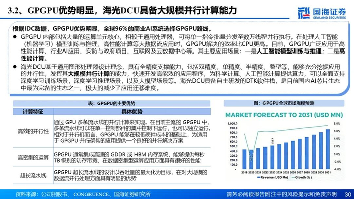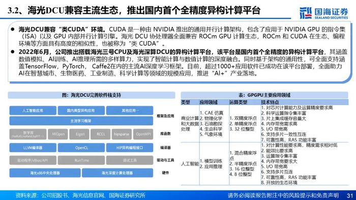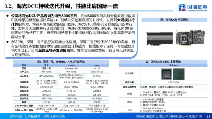 2)DCU:DCU规划为海光8000系列,GPGPU优势明显,具备大规模并行计算能力,同时兼容“类CUDA”环境。目前深算三号研发进展顺利,性能实现翻倍增长,预计将迅速实现大规模应用。