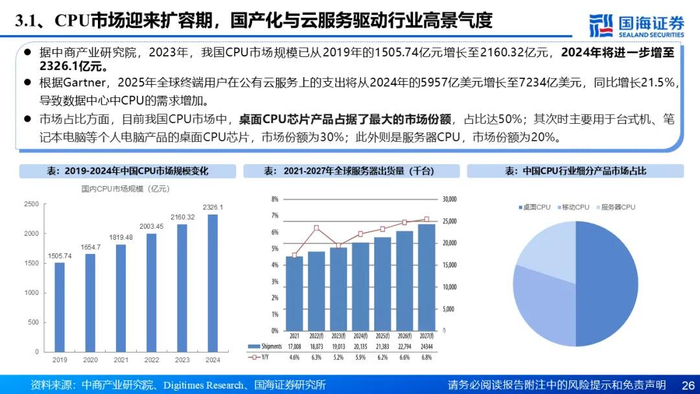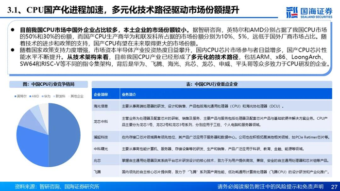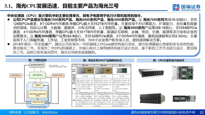 1)CPU:CPU细分为海光7000、5000、3000系列产品,兼容国际主流x86处理器架构和技术路线,具有先进的工艺制程、优异的系统架构、丰富的软硬件生态等优势,目前在售产品主要为海光三号。